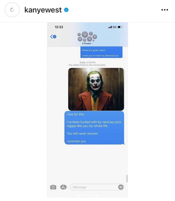Now it’s been 3 years since these two have beefed and while it isn’t clear what started this round of their beef But Kanye’s shown he’s more than able to oblige Drake’s shots. Kanye responded with a screenshot of a textthread between him, Drake and Pusha T. He sent a pic of Joaquin Phoenix as the Joker, captioned with “I live for this. I’ve been f***ed with by nerd ass jock n***** like you my whole life. You will never recover. I promise you.”